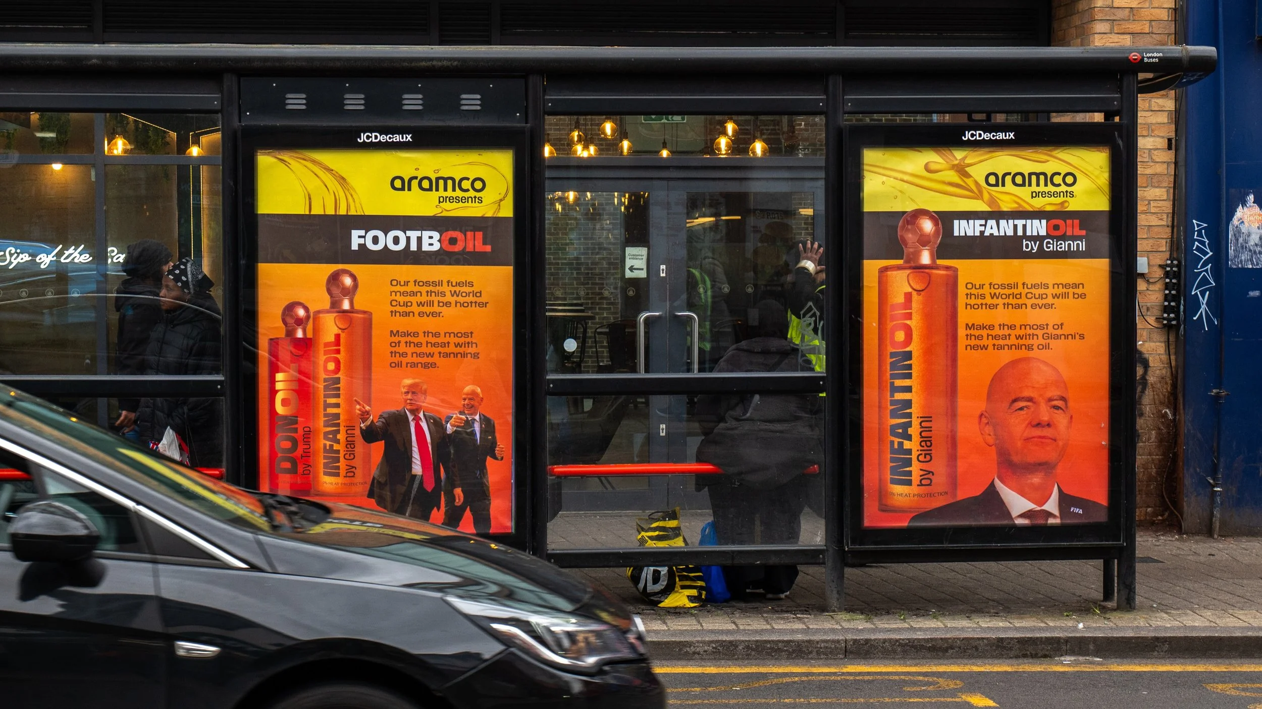 The FootbOil line, made up of InfantinOil and DonOil, debuted around England’s recent match at Wembley. Fan campaign group Fossil Free Football were on hand to see what supporters thought about Aramco’s step in cosmetics (watch their street interview videos here and here). FootbOil advertising material appeared on bus stops, an ad van and on TFL trains in London as well as around the stadium where the Netherlands played their own World Cup warm up. The campaign also made it to FIFA’s home town of Zurich and even appeared in the FIFA museum!